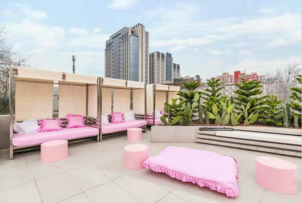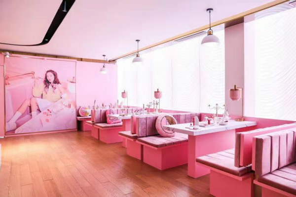 快闪店几乎完全参照了该品牌位于韩国明洞的旗舰店风格,从服装和彩妆的陈列、空间的分割和设计,到餐厅、躺椅、浴缸、水池等细节元素,全部遵照了“网红打卡胜地”的标准来配置——这也是该品牌的核心价值之一。