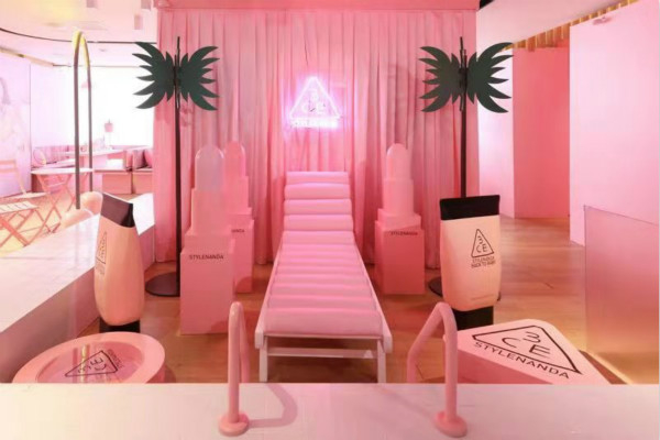 Stylenanda最早从 2012 年便开始开设以独立大店为特色的实体店,并将其作为营销手法之一,3CE作为同门彩妆线也总是随店陈列售卖。在游客热衷打卡的韩国明洞的Pink Hotel旗舰店,女孩们可以穿着漂亮的衣服坐在粉红色浴缸的透明球堆里拍照,并上传到社交网站。实际上,门店里的每个角落似乎都可以成为一处好看的拍照背景,对女性消费者有极强吸引力。除了韩国本土市场,Stylenanda还在东京原宿开了门店,进驻伊势丹百货,3CE 则通过丝芙兰在香港、泰国和印尼市场销售。