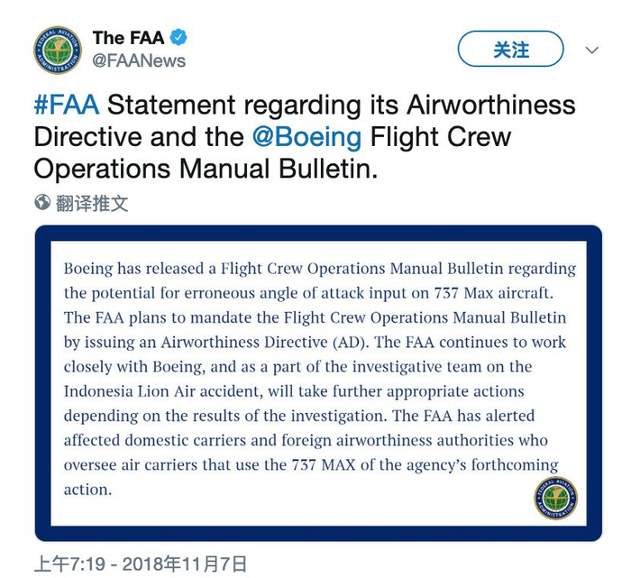 之前,波音公司发出的公告并未要求检查或更换传感器或飞行控制计算机。更确切地说,波音公司现在正在做的是告诉飞行员如果碰到这样的情况应该如何操作。正如它的公告所说它在“指导航空公司如何培训机组人员在现有的条件下处理高攻角传感器(AOA)数据错误的情况。”