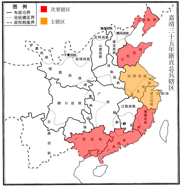 嘉靖《宁波府志》有具体说明:“总兵府都督一人,掌凡镇守浙直地方、备御倭夷、保安军民之事……凡水路之寇,调度各省沿海军马而逐捕之。凡重大之事会同各巡抚及副总兵议而行之。境内所属知府以下,若参将、守备、把总等官皆得其节制。”