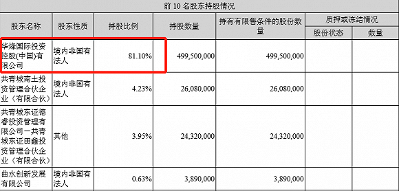 通过查阅华宝股份年报摘要,财联社发现,华宝股份的股东结构有着极大差异。在第一大股东华烽国际的持股比例高达81.10%的情况下,二股东共青城南土投资持股4.23%,三股东共青城东证德睿持股3.95%。