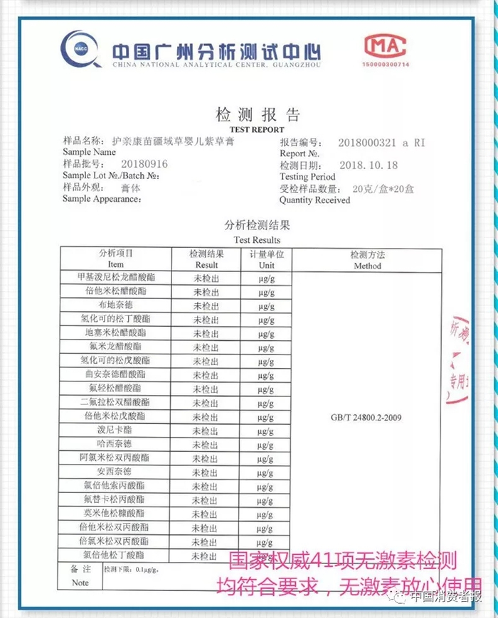 如江西众乐堂实业有限公司生产销售的“苗疆域草婴儿紫草软膏”被检测出含有地塞米松醋酸酯、地塞米松、莫米他松糠酸酯、倍他米松醋酸酯等4种激素。其中,地塞米松醋酸酯含量堪比药膏,达到476.6mg/kg,地塞米松检出含量11.6mg/kg。与其官方宣传的“不含激素”不符。