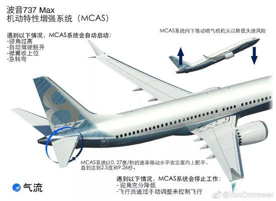 为解决这一问题,波音在737-MAX系列上新增了一个名为MCAS(机动特性增强系统)的系统,在必要的时候实现飞机“自动低头”的功能。