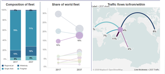 波音预计,到2037年,中国航空市场将新增7690架飞机,机队规模将翻一番,飞机数量占全球商用飞机总量的比重将从目前的15%上升到18%,和其他地区不同的是,由于国内、海外旅行需求的上升,以及中国电商迅速发展推动的货运需求提升,波音预计中国未来在窄体机、宽体机和货运飞机方面都有强劲的需求。