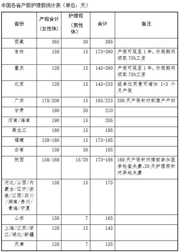 注:产假合计包括国务院《女职工劳动保护特别规定》规定的98天产假和各省在人口与计划生育条例规定的奖励产假。