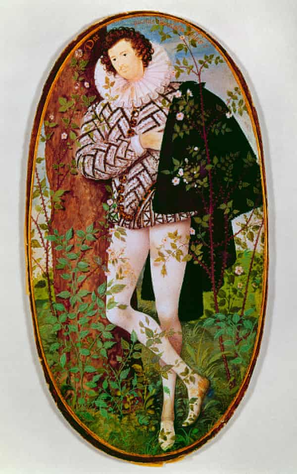 一个年轻的男人,身穿微微拉开的白衬衫,裸露出胸部,乌黑的头发就像是火焰,而他额头上的“火焰”就像是要喷发出来。金色的火焰环绕着他,但他却毫发无伤。这是伊丽莎白时代爱情诗中塑造出的一个形象。大约在1600年,尼古拉斯·希威德(Nicholas Hilliard)在一块7厘米高的椭圆形牛皮纸上描绘出了这个不为人知、但又炽热的年轻人。这件作品也是希威德的大型作品之一。然而,这个小小的杰作也是了解他微型艺术的关键,帮助我们了解它被绘制出来的原因,以及为何它在400多年后仍旧充满生机。