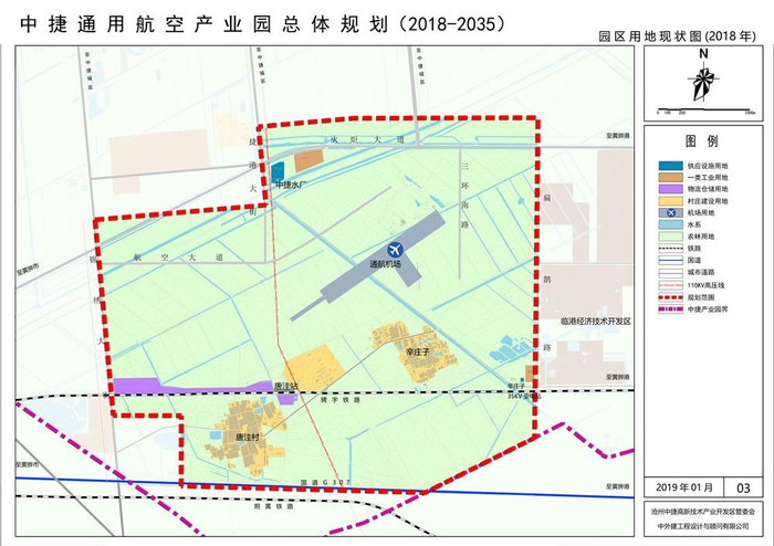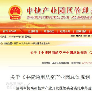 2019年3月12日,河北省沧州高新区规划建设局发布关于《中捷通用航空产业园总体规划(2018-2035)》公示的公告。本次规划期限为2018年至2035年。其中近期为2018-2022年,远期为2023-2035年。规划至2035年,规划区总面积为16.3平方公里,其中城市建设用地规模为10.98平方公里。规划构建“一心、四轴、七板块”的空间布局结构。