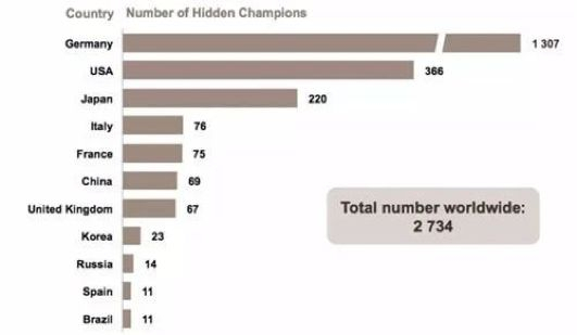 赫尔曼·西蒙收集了全世界3000家隐形冠军公司的数据,其中德国共拥有1307家隐形冠军,是数量最多的国家。如以百万居民口径下的“隐形冠军”数量考量,德国更是绝对领先。