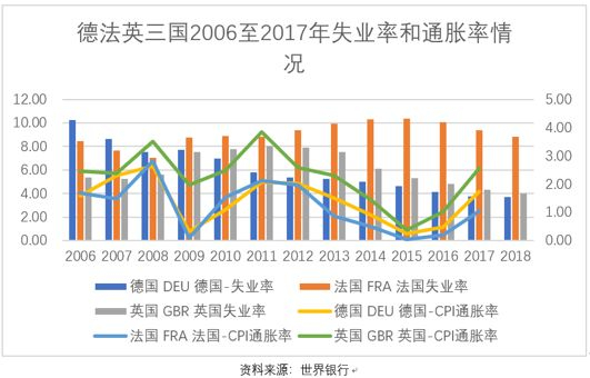 欧洲债务危机以来,整个欧洲都在和通货紧缩做斗争,因此低通胀的环境里,货币政策仍有扩张的空间。与同受欧盟央行货币政策控制的法国相比,德国的通胀率也要好一些(注:英国的货币政策独立于欧盟)。真是没有对比就没有伤害,德国的失业率也比法国低了好大一截,这展示出德法两国迥然不同的境遇:德国因低失业率,居民的收入有保障,自然因消费有支撑而获得更多的增长动力。而法国则深陷泥潭,“黄背心”示威抗议不绝,背后的本质原因就是失业率居高不下,居民增收困难,以至于消费不起,消费不振自然不利于提振经济增长。