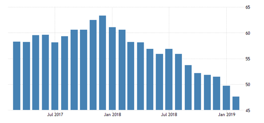 其二、德国2月制造业PMI终值47.6,从2017年的峰值63.3自由落体般一路下滑,降至荣枯分水线之下,制造业活动趋于萎缩。