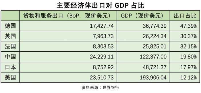 德国出口对GDP的占比冠绝天下,背后隐藏着两个关键信息:一是德国经济的全球化程度非常高,德国的货物和服务畅销于世界各地;二是德国的货物和服务在全球范围都很有竞争力,否则就无法满足国外市场的严苛要求。
