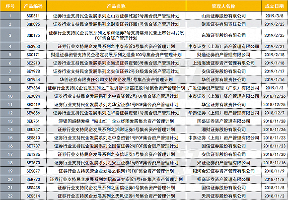 财联社以“民企”、“民营企业”、“纾困”为关键词,在中国证券投资基金业协会官网查询发现,目前已在官网备案的证券行业支持民企发展的集合资管产品共22只,具体名称如下: