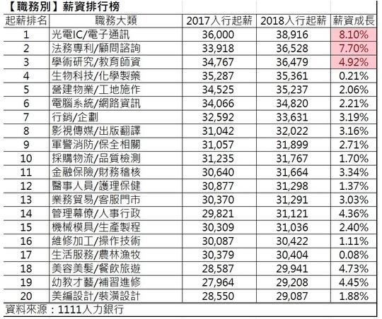 据台湾1111人力银行“台湾2018年度薪资调查”显示,去年薪资水平36500元,相较于2017年的36200元,略为提升1.02%,其中起薪最高的行业是“电子科技╱信息╱软件╱半导体”,入行就有35400元,紧追在后的是“建筑营造╱不动产相关”,起薪在34800元。第三名是“金融投顾╱保险相关”,薪资在34500元。