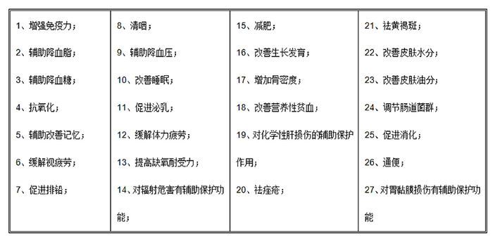 2016年国家食品药品监督管理局认可的保健食品的申报功能如下:
