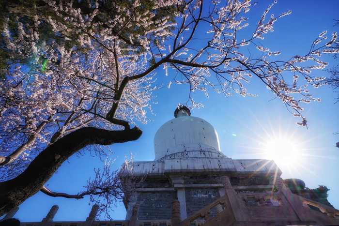 北海公园琼华岛山顶处的山桃花已进入盛花期,在琼华岛山顶与高耸的白塔、汉白玉石栏相映,吸引了不少游客在此赏花、拍照。北海公园阐福寺山门前的山桃花成片,近些年逐渐走红,每当3月中旬山桃绽放时,都有成批摄影爱好者前来拍摄。