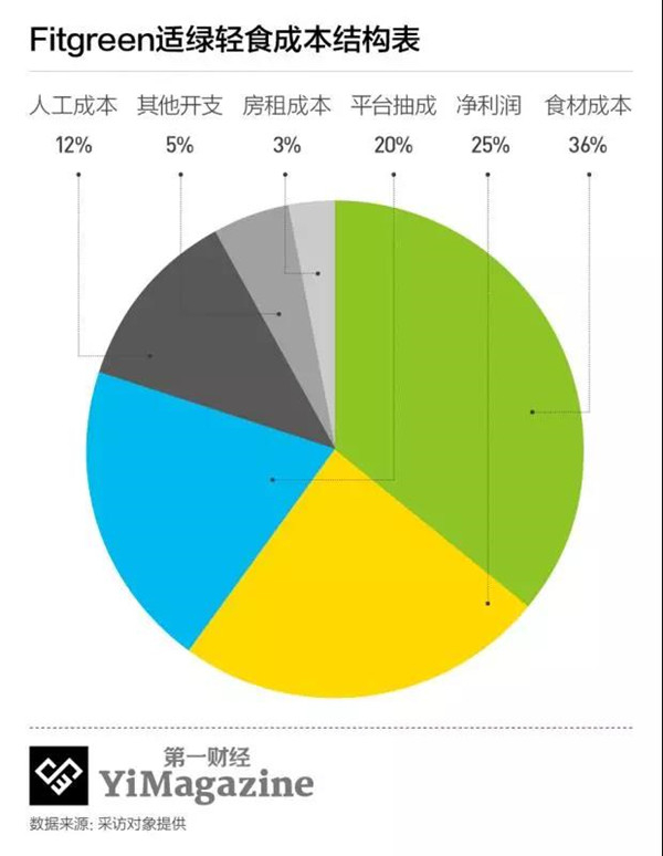 据他介绍,目前食材占据营业额的40%至45%,人工成本占到10%,房租成本占不到5%,但平台需要抽成20%的佣金,一家新开的点位大约花费1个月左右的时间就能够获得盈利。为了降低平台抽成,他正在开发Fitgreen适绿轻食的自有平台,掌握获客的主动权,降低营销费用。