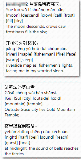于是,不少热心的华人用英文翻译了这首《枫桥夜泊》,还附上了拼音和每个字的意思:
