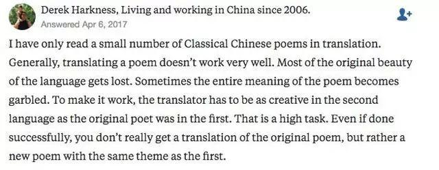 这位网友还举了个将古诗翻成英文就失去美感的“栗子”。