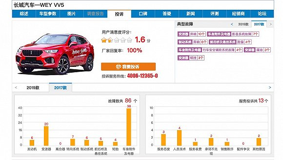 在全国汽车消费者投诉受理处置服务平台车质网上,长城汽车WEY VV5的用户满意度评分仅为1.6分。车主关于2017年款车型的86个故障投诉中,车身附件及电器故障多达38个,变速箱异响问题为10个,转向系统、制动系统和发动机也均出现了6个左右的故障。车主常见故障主要集中在“变速箱异响维修后未解决”、“发动机抖动冒黑烟厂家未解决”和“发动机漏油怠速低变速箱漏油异响”,前述问题均涉及汽车核心三大件。