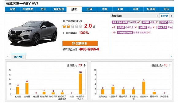 长城汽车WEY VV7则是WEY家族中车质网上用户满意度评分最高的一款车型,但也仅为2分。2017年款车型的故障数为73个,车身附件及电器故障多达33个,变速箱故障为18个,发动机问题为12个。与其它两款车型出现故障的部位相同,长城汽车WEY VV7也没有将精力放在提高三大件耐久性上。车主常见故障主要集中在“发动机抖动变速箱异响加速无力”、“行驶过程中变速箱有异响声”和“变速箱发动机漏油涡轮管路破损”。