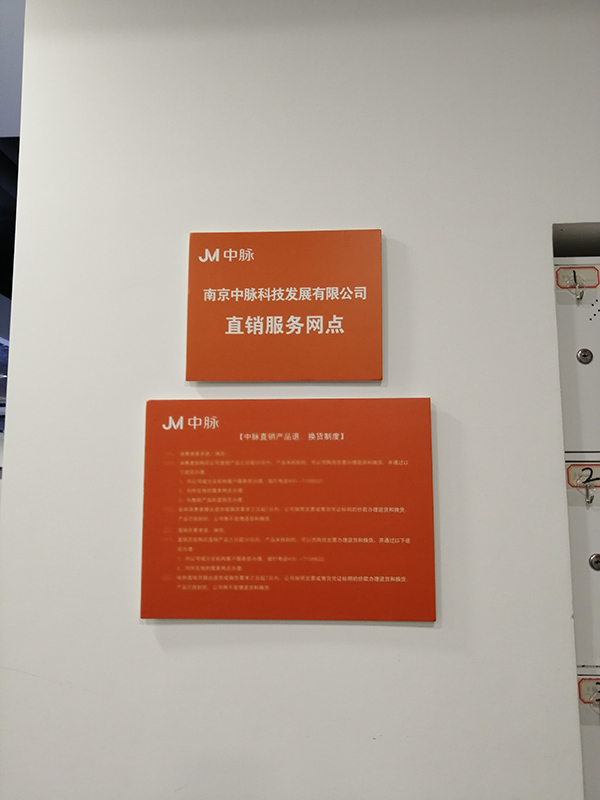会所门口贴着“南京中脉科技发展有限公司直销服务店”的橘黄色标志,左侧墙上贴着中脉的历史和荣誉。