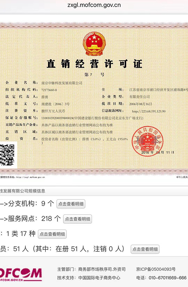 商务部直销行业管理平台数据显示,南京中脉科技发展有限公司于2006年获得直销牌照,获批9个分支机构和218个服务网点,直销产品包括1类17种。