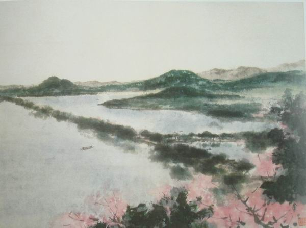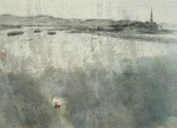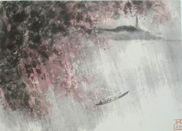 《江南春雨》,远处如果没有这个保俶塔,说什么地方都可以,松花江、富春江都行,还有这个船。扬州的瘦西湖和我们杭州,还保留着上面一块帆布,下面这种木结构的游船。