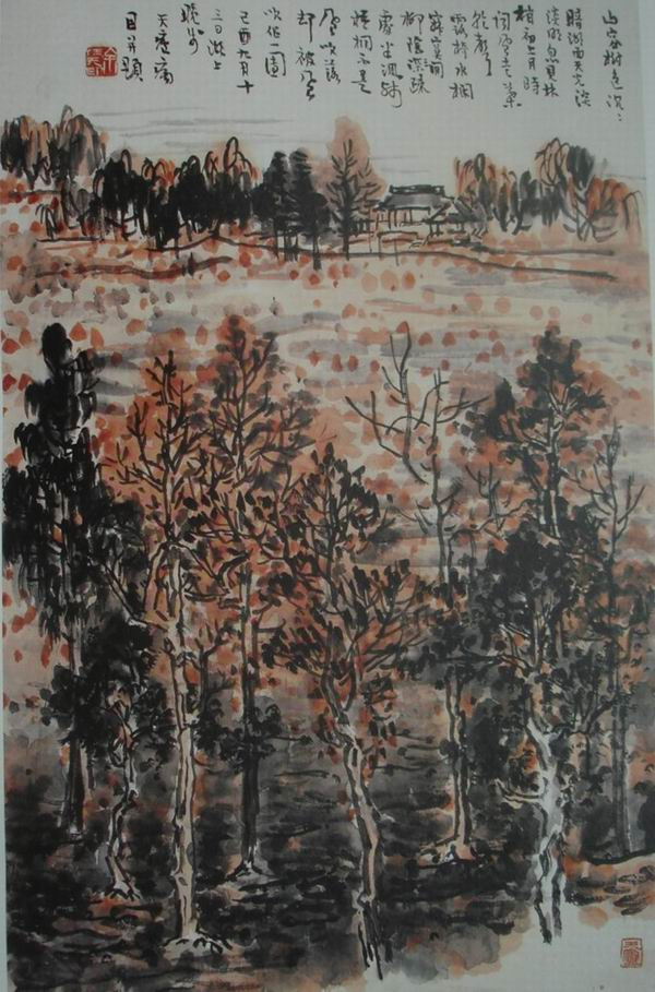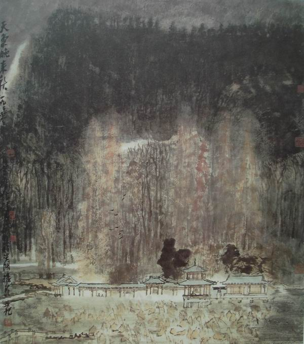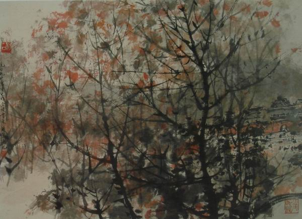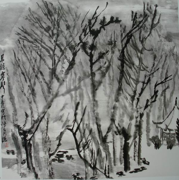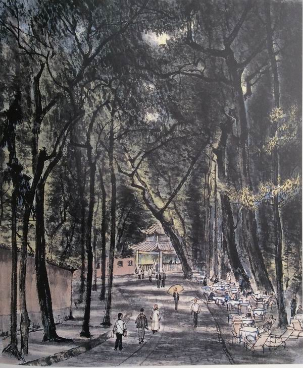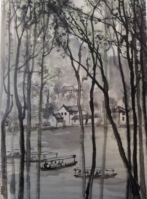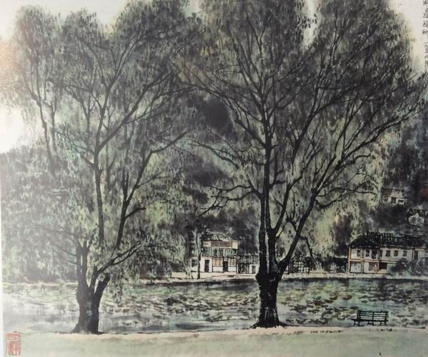 童中焘先生的画,在杭州的朋友都很熟悉。我们选一些画西湖的作品看看,看看老一辈怎么处理对象的。《曲院风荷》横平竖直的构图,把远山拉高撑出画面,把西湖画出大山大水的感觉。《晚晴》画的是柳浪闻莺,南山路的校园前面,柳浪闻莺北门进去路边上有个草坪,以前夏天还放露天电影,草坪边有一丛树,树荫里有一些因地取材的石凳、石桌,时常有一些老年市民在这里遛鸟。记得童中焘先生住在南山路的时候,下午会去那边散步。我们经常看到艺术家出去写生或者体验生活,这里就涉及艺术创作的生活在什么地方?有时,生活不在你要去的远方,就在自己熟悉的此地,能够把自己最熟悉的生活环境转换成一种艺术语言,比出去写生的发现更平常更感人。这张《且听寒声》也是表现同一个地方的这丛树,用湿笔试试看画面的效果,接着再用干笔画另一幅,不停地画同一块景色,难道不烦吗?相信这个时候画家面对相同的对象,反而给画家留下不同语言尝试的机会,那些越熟悉越平凡不起眼身边的对象,你还能有绘画的欲望,并处理出一种巧来,一种妙来,会更非比寻常。
