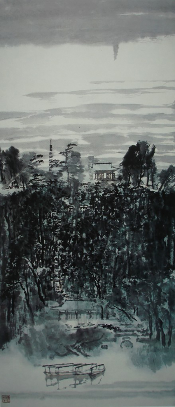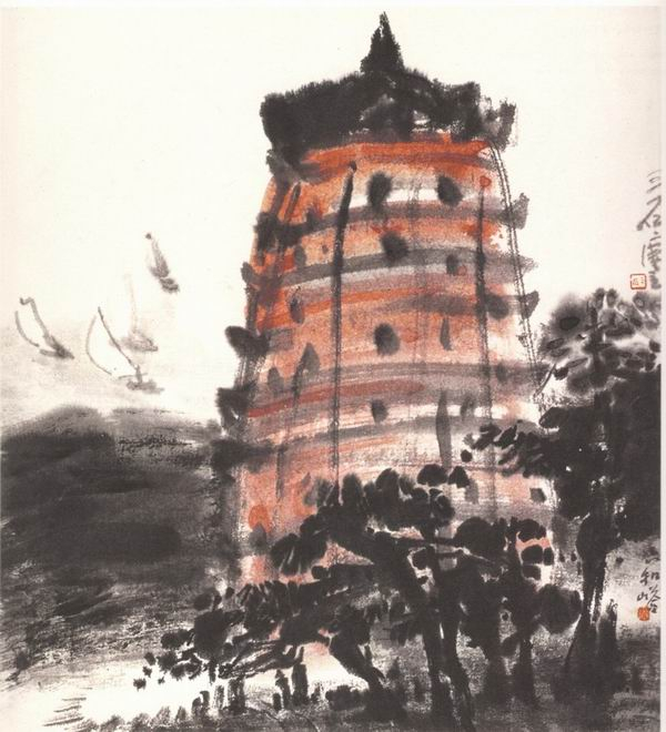 《西泠晚烟》作品上面保俶塔倒影的呼应,并不是现实景色中可以看到的,这么处理在画面起什么作用?不用我讲,大家都是行家,这种视觉形式的考虑,总在老一辈优秀画家的作品看到,他们运用的既含蓄又巧妙,仿佛世界应该按他们的画面去调整会更好似的。湖面倒影的山、保俶塔尖,西泠印社华严经塔,都是我们熟悉的景物。还有西泠印社门口,最难处理的就是底下这块湖面与湖岸的关系,又是一招以实为虚,这里的虚与曾宓画六和塔的虚不一样,再来几条船,老一辈画家画画的花花肠子多着呢!是不是?所以潘天寿先生会说,做人要老实,画画要不老实。