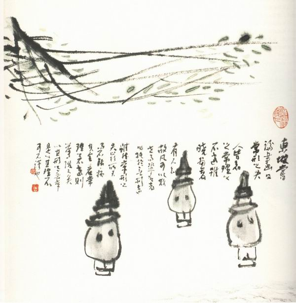 《三潭印月》儿童画加装饰画的造型。简单的装饰是很不入中国画的,曾宓先生就能入,简直有点化腐朽为神奇。他是怎么处理这些元素的呢?他这么处理画面的理由在什么地方?我老在想这些问题。包括这张《皆大欢喜》灵隐的欢喜佛,谁都在画灵隐弥勒佛,曾宓先生的处理,真有他超出常人的地方,这种处理转换的能力,在当代还真不太找得出来。曾宓先生也是很会利用肌理的画家,他利用肌理是为其所用,肌理只是画面中的抽象因素或者说模糊的因素,并不依靠肌理来支撑画面。看曾宓先生的作品,觉得作者会是一个很有趣的人。比如这张《六和塔》,我天天乘公共汽车经过钱塘江大桥去转塘上班,看着六和塔过桥,觉得它是极其不入画的对象,很难画,圆乎乎的一个塔矗立在平缓的山坡上,植被也很好,山坡看不到一片裸露的岩石,不是说山无石不奇吗?但是曾宓先生会换一个角度,从山坡那面看塔,远处几片帆影,让画面活了起来。塔身上横竖的用线像速写,按我对传统用笔的理解,画得并不好,有点刷笔的感觉。但是正是这寥寥几笔反而让画面以实为虚空灵起来,画面造型、用笔无处不透露出老先生的机智与才气。