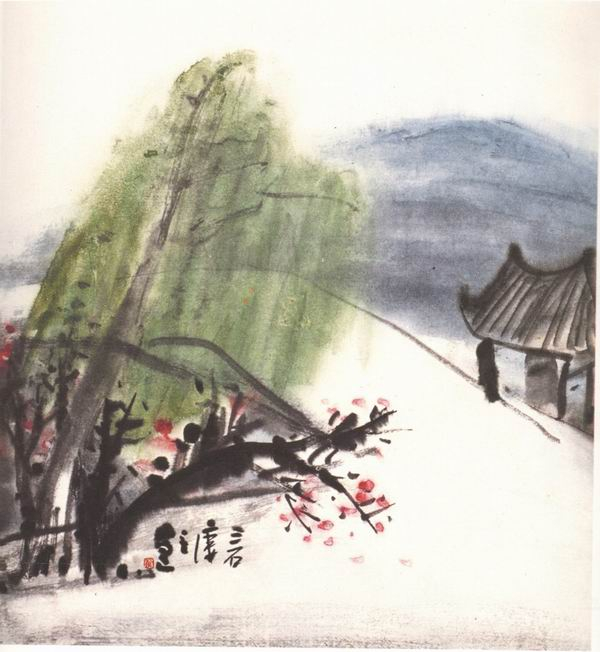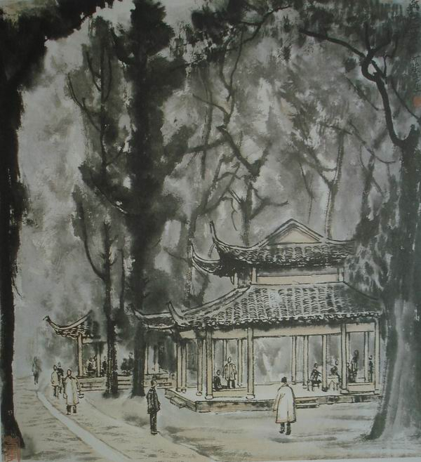 看几张傅抱石先生画杭州西湖的作品。《虎跑深秋》,画家对待客观景物与艺术处理的关系,这条进山门的路还在,我们可以去看看,两山迎面相夹,石板小径缓缓而上,傍晚的时候进去转转,深山古寺的幽静,下雨天进去的空濛,我从来不会在晴天游人很多的时候进去。