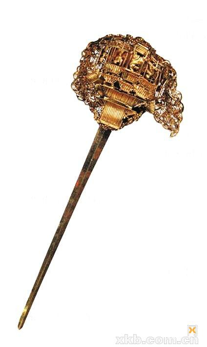 江西南城县长塘街益庄王墓出土。簪首云形,上有一重檐楼阁和五座牌坊,每座牌坊内有一舞蹈人。这种造型的金簪在明代比较流行。