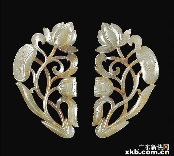 器双面镂空雕刻一枝莲,由叶、果实和花组成。折枝花是宋金时期玉雕工艺的创新题材,花枝交错、翻转掩映,形成多层次和立体的效果。从器型看,此可能是簪首,底部嵌于金银材质的簪体。