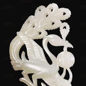 此器扁平体,双面雕。孔雀凹点眼,衔绣球正欲飞翔。翅膀用两排竖阴线雕刻,间以横线相隔。花尾上翘,尾根部上下并列两个钻孔,应为嵌接其他材质的簪体之用。