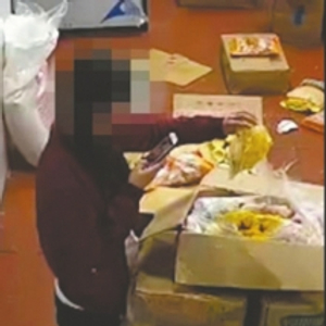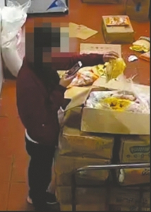 犯罪嫌疑人文某某正将姜黄粉抖落在食材上,改变其原始形态并拍照。(监控视频截图)