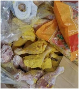 22时25分,一名女子又拿起没有撒完的半袋姜黄粉,继续撒向鸡腿。之后一手举起手机,一手拎起剩下的姜黄粉拍照。