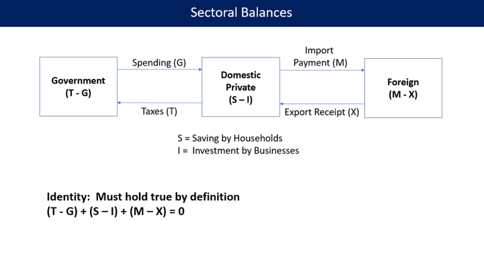 之所以会产生这样的误解,主要是因为MMT一直在解释为什么政府部门的赤字是不可避免的。要理解这点,就需要引入 Godley 的部门均衡法。如下图所示,如果将经济分成政府、国内私人部门和外部三个部分,那么由于收入必须等于整个经济的支出,因此经济各个部门的收入和支出之差的和也必须为零。因此,如果一个部门的支出低于收入,那么它一定是在积累其它部门的 (净) 债权。因此,在美国政府进出口长期赤字的情况下,如果想要私人部门盈余,政府部门只能赤字。