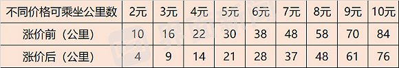 涨价后,2元起步价可以坐4公里,每增加1元分别增加5/5/7/7/9/11/13/15公里的里程。对比起来,起步里程减少了,每增加1元能够乘坐的里程也减少了。