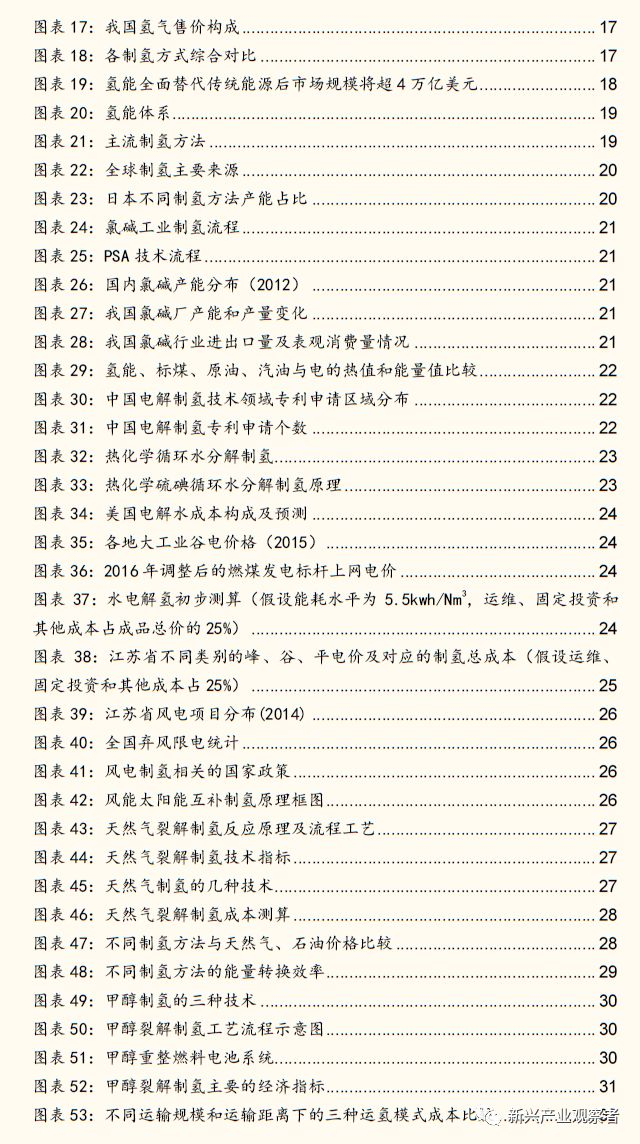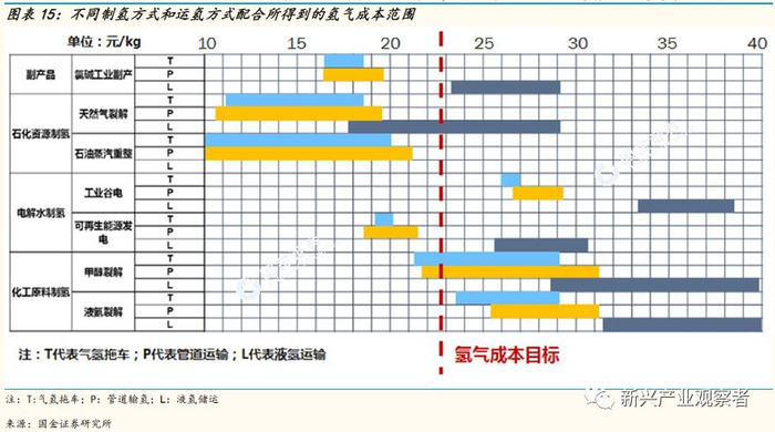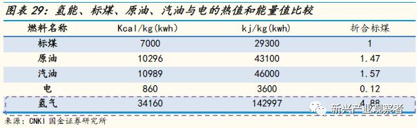 成本方面,天然气裂解制氢的成本约为9~16.85元/kg(即0.8~1.5元/Nm3之间)。我们根据中石化集团经济技术研究院所提供的一些数据测算如图表34。天然气制氢虽然成本方面有优势,但需要针对性地制氢,对于前期投资要求较高,且制氢过程会产生一定的污染。