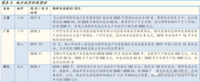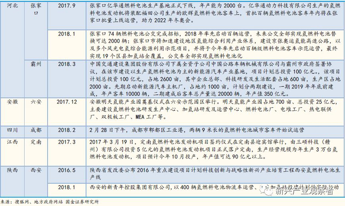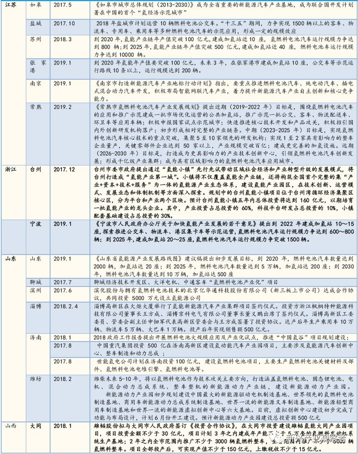 地方政府中,富氢优势、弃电较多或者产业领先为代表的地区重视燃料电池发展。多地市兴建氢能产业园区,氢能小镇和产业集群等,推动燃料电池公交、物流车示范运营,截至目前超过20地市明确推动氢燃料电池产业发展。目前仅上海、武汉、山东、苏州、张家口、佛山、盐城和大同等地规划显示,到2020年燃料电池汽车数量将超过1.5万辆。