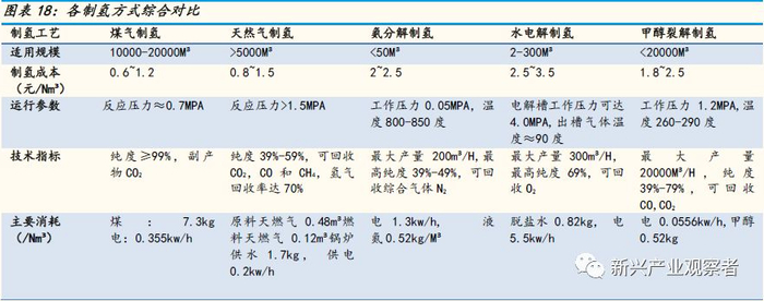 石化资源制氢:主要是天然气裂解制氢路线,燃料电池所用氢气一般不使用煤制氢的技术路线,主要是因为煤制氢存在投资成本高、污染严重和碳排放量大等问题。天然气制氢技术主要包括水蒸气重整、部分氢化、自热重整、绝热催化裂解等。