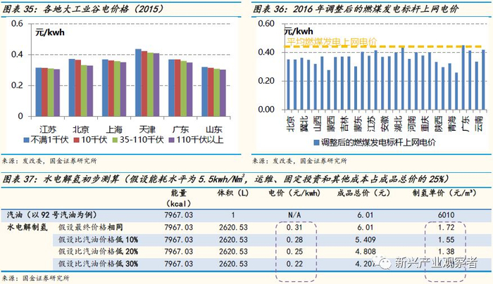 根据我们的测算,在不考虑运输成本的条件下,假设运维和固定投资的成本占电解水制氢的总成本的25%,计算出水电解制氢达到能够和汽油竞争的水平,电价必须保证在0.31元/kwh以下,如果考虑比汽油的价格更有竞争力的情况,则对应较92号汽油价格低10%、20%、30%的情况,电价分别需要达到0.28元/kwh、0.25元/kwh和0.22元/kwh以下。