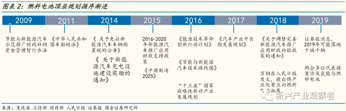 中国对于燃料电池发展支持处于循序渐进状态,我国从 2001 年就确立了“863 计划电动汽车重大专项”项目, 确定三纵三横战略, 以纯电动、混合电动和燃料电池汽车为三纵,以多能源动力总成控制、驱动电机和动力蓄电池为三横。近期随着燃料电池产业发展逐渐成熟,中国在燃料电池领域的规划纲要和战略定调已经出现苗头,支持力度逐渐加大,政策从产业规划、发展路线和补贴扶持全方位支持燃料电池产业发展。
