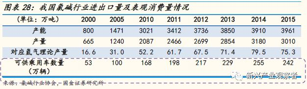 根据国家统计局的数据,2015年,我国氯碱厂产能为3961万吨,产量为3028.1万吨。根据氯碱平衡表,烧碱与氢气的产量配比为40:1,理论上将产生氢气75.7万吨,即85亿Nm3氢气,理论上可以供243万辆乘用车使用。但考虑氯碱厂区域分布、运输距离、期间损耗及不同车型的耗氢量,几十万辆的规模问题不大。