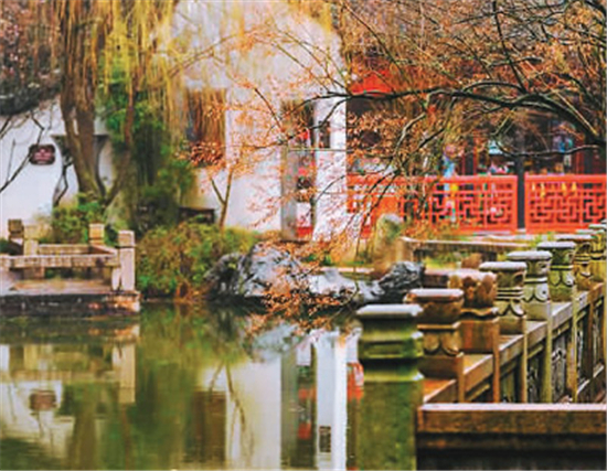 退思园中,闹红一舸最富动感。舸由湖石托出,半浸碧水,水流漩越湖石孔窍,潺潺之声不绝于耳。石舸突兀池中,风吹不动,浪打不摇,人站船头,却有小舟荡漾之感。立于舸首,春雨淅沥,风渐劲,恍惚飘零于无涯的汪洋。又念起李白的诗:“君不见黄河之水天上来,奔流到海不复回。君不见高堂明镜悲白发,朝如青丝暮成雪……”再细嚼“退思”二字,颇多滋味涌上心头。待到冷暖看尽,唯愿在这缠绵如雨的江南,找到一位情深如水的佳人,过上织网打渔、荷锄种地的平常生活。(应志刚/文图)