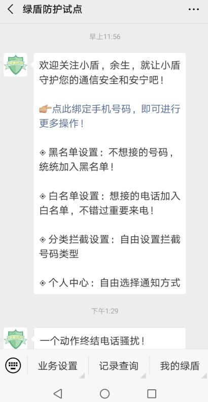 “绿盾”防护是中国移动旗下的高频骚扰电话呼叫拦截服务,采用云端拦截技术,无需安装app,为用户提供骚扰、诈骗电话拦截服务。用户可通过拔打10086人工客服、编辑KTFSR(QXFSR)发送到10086、到全省各归属地移动营业厅开通或取消。目前,该项服务已在广东、江苏、北京、上海、山东、四川、河南、福建、天津、重庆、浙江11省市试点。