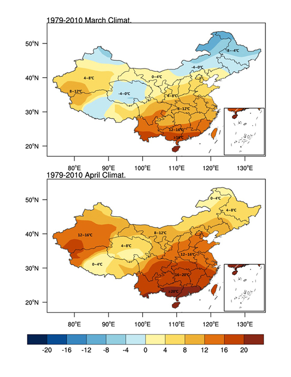 从气候态来看,南方大部地区3月平均最高气温都上升至10℃以上,4月平均最高气温都在20℃左右。其中以南京为例,3月最高平均气温为13.9℃,4月可达21.5℃,气温上升比较快。