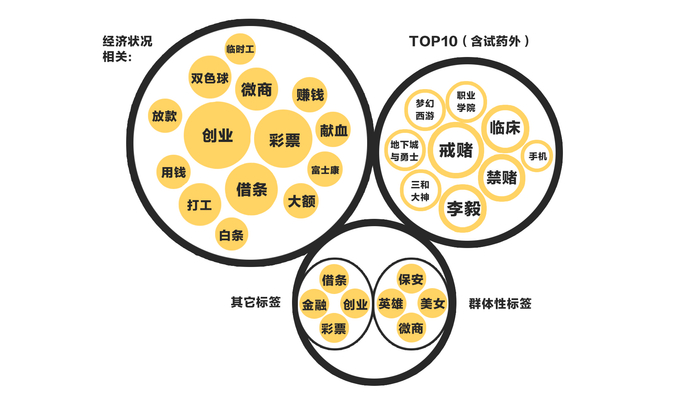我们使用文心系统对贴吧9004条帖子文本进行了情感分析。正面情绪词占44%,负面情绪词占30%。虽然词云中出现了“忽悠”、“骗子”、“副作用”等词,显示贴吧里存在一定体量的负面信息揭露贴,如曝光假中介;但整体而言,“试药员吧”讨论偏向正面,如不少吧友在积极发布与试药有关的科普贴。由于GCP规定仅受试者本人和医院可以查阅受试者个人信息,我们无法直接获取全国受试者的年龄、性别、职业、所在地等一手数据。因此,我们采用侧面画像的方法,通过抓取“试药员吧”共计6713个吧内会员的百度个人主页信息,试图通过他们的兴趣延展面来侧面描绘他们的群体特征。我们对吧友个人主页的标签进行聚类分析,发现两个共同点:一是大多面临着经济问题,较严重的有欠债、赌博,较轻的如兼职赚钱、打零工;二是职业状态不稳定,打工族、学生占比重较大。