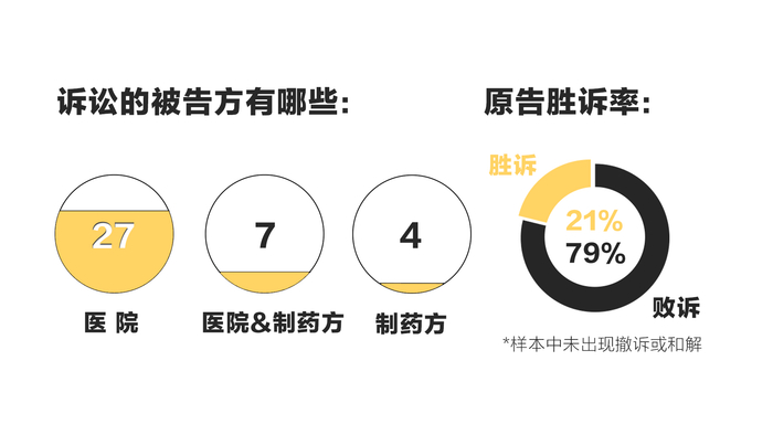 在患者维权的38个案件中,有27位患者将医院作为被告起诉至法院,7位将医院和制药方作为被告,剩下4位则起诉了制药方。