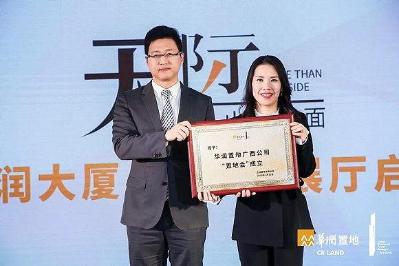 “华润置地广西公司置地会”也于当晚正式成立,华润置地华南大区写字楼市场部副总经理杨贤钊先生在活动现场为置地会授牌。